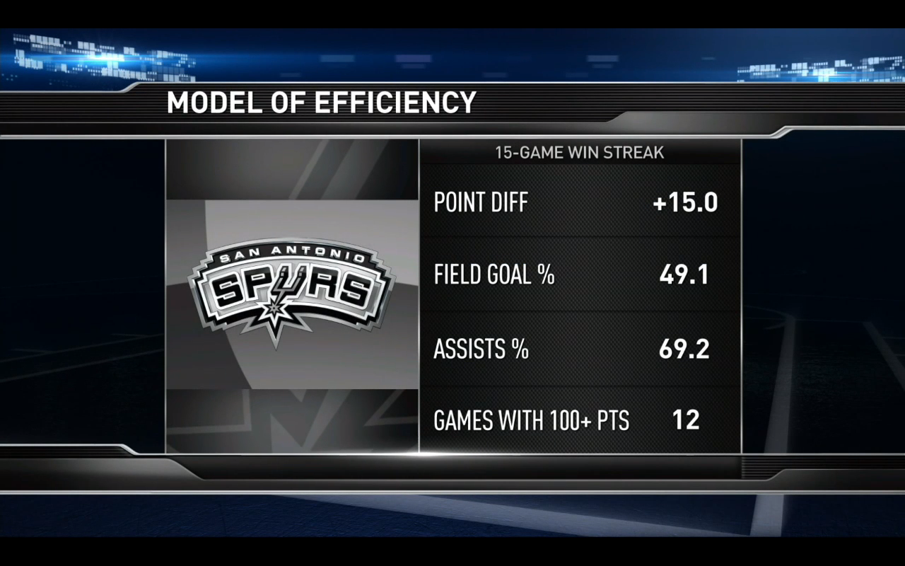 Les texans sont sur une série de 15 victoires consécutives au meilleur moment possible: à l’approche des playoffs. Les chiffres sont simplement fabuleux durant ce run, au niveau collectif. Les Spurs sont à 49.1% de réussite au shoot (avec le plus de paniers convertis de la ligue, 41.3 par match), avec un splendide 41.0% à 3pt (seuls les Lakers font mieux, 41.9). Avec une moyenne de 109.2 pts par match, c’est la troisième attaque de la ligue juste derrière les Clippers et les Rockets. Mais le chiffre qui fait des Spurs ce qu’ils sont, c’est le nombre de passes décisives: 26.9 sur les 20 derniers matchs, soit 26.9 passes sur 41 paniers, un ratio de 65% des tirs convertis en provenance d’une passe décisive (69.2% sur les 15 dernières victoires).