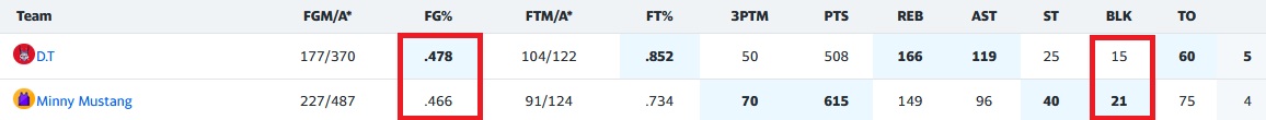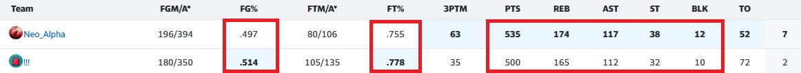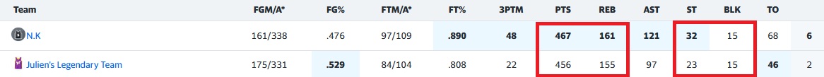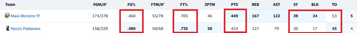 Côté étalon d’Afrique, on peut bien regretter de perdre cette match-up qui tendait les bras, à cause d’un manque de polyvalence et accessoirement d’un scoring débridé qui n’a pas été réalisé en toute efficacité. Pointons les maladroits : Maxeyu (39.3FG%), Klay (39.5FG%) et pas moins de 6 autres joueurs à moins de 46%, c’était déjà pas génial. Si on rajoute quelques horreurs aux FT% comme Avdija (64FT%),Sharpe (60FT%) ou Holmgren (50FT%), ça pique! Bon, on a quand même des joueurs en offensif portés par Anthony Edwards (110pts à 51FG%, 11 3PTM, 15rbds, 8st)! Il est bien suivi par Avdija (96pts, 8 3PTM, 30rbds, 36ast, 4st, 3blks) et Sharpe (67pts, 8 3PTM, 12rbds, 7st), expliquant aussi par cette belle versatilité la victoire des petites cumulatives. Klay ajoute du scoringf (10 3PTM), Holmgren sécurise les blks (6) et Brandon Miller retrouve des couleurs (55pts, 8 3PTM, 2st, 4blks) avec NAW (61pts, 9 3PTM, 4st), mais la semaine cata de Maxey et le frontcourt faiblard, auront eu raison des velléités de victoire.