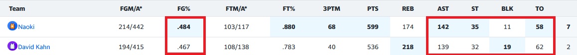 C’est simplement le backcourt le plus qualitatif et quantitatif de la ligue que possède Naoki pour aligner des stats pareils, roster uniquement et structurellement plus fiable aux RBDS/BLK! On aligne, attention, un certain SGA (113pts à 56% et 85%, 21rbds, 25ast, 7st) couplé à un certain Jamal Murray (117pts à 88FT%, 20 3PTM, 20rbds, 32ast) et…excusez-moi, LaMelo Ball de retour (68pts, 14 3PTM, 13rbds, 23ast), c’est un trident assez inédit à ce niveau de qualité! Si vous rajoutez à cela, des arrières au diapason, merci Powell (65pts, 18rbds, 13ast, 5st) toujours aussi monolithique et une raquette plus penché pour la versatilité que les RBDS/BLK, ça détonne. Julius Randle (70pts, 16rbds, 20ast, 6st) domine les débats devant Okongwu (53pts, 6 3PTM, 29rbds) et le retour timide de PG13 et Jarrett Allen. Le trident infernal est à l’origine de 29 des 58TO, ce qui en dit long sur la propreté du reste de l’effectif, mais aussi à l’origine de 39 des 68 3PTM, 298 des 599PTS etc….bref ils ont fait un peu partout la moitié du taffe avec un all-aroundisme exemplaire, c’est un combo difficile à battre.