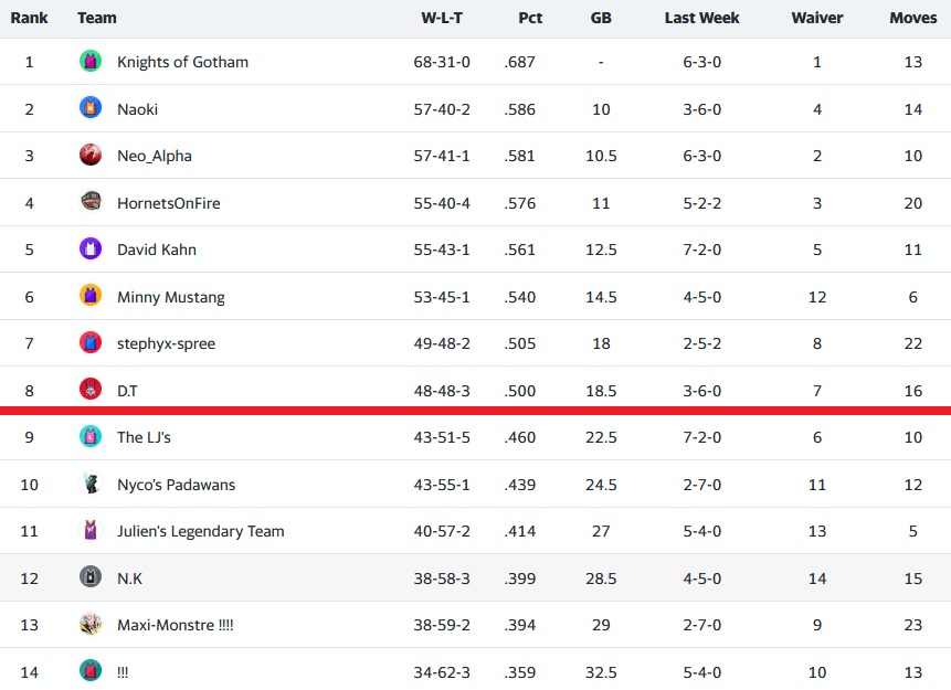 Comment répondre à un tel déferlement quand on joue sans Aaron Gordon, Domantas Sabonis et à nouveau Mathurin, parti pour ne plus revenir. Le tout, avec une mauvaise nouvelle supplémentaire : la baisse de régime de plusieurs joueurs du supporting cast (Spencer, Bagley, Holmes entre autre). On retrouve cependant un Core6 qui ne démérite pas et cherche notamment les BLK, on n’est pas loin de chercher une défaite de voleur aux FT%/ST! Derrick White reste encore une valeur sûre (725pts à 94FT%, 9 3PTM, 16rbds, 20ast, 3st, 11blks) et permet de chercher les contres par sa proéminence presque bizarre dans le domaine. On y retrouve aussi Desmond Bane en soutien (81pts, 8 3PTM, 23rbds, 19ast, 3st, 3blks) et les new-yorkais, KAT (55pts, 33rbds, 10ast) – Mikal (49pts, 8 3PTM, 20rbds, 24ast, 7st) qui n’ont pas démérité, hélas, en étant bien insuffisants. C’était simplement trop short pour tenir le choc.