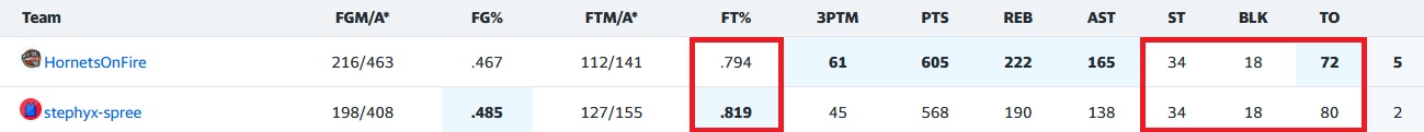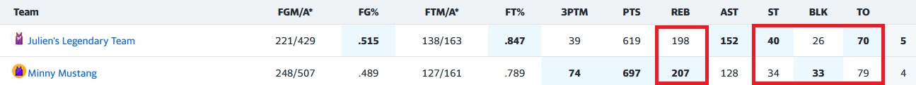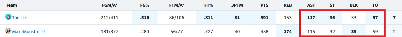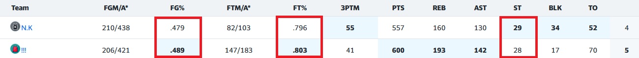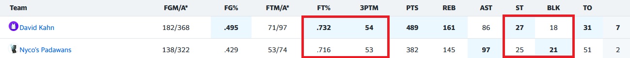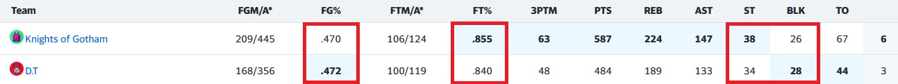 Les deux teams ont été sur l’offense mais Néo a des joueurs plus complets, il fait la différence nettement aux petites cumulatives 3PTM/ST/BLK et ça paie. Privé de Christian Braun, DeJounte Murray, Jalen Duren et Claxton, le roster de Néo sort une folie offensive rare! Giannis est logiquement MVP avec une semaine gargantuesque et la victoire aux FG pour lui (124pts à 65FG%!!!! 40rbds, 16ast) pour donner le ton! Il est entouré d’artilleurs patentés entre Murphy III (63pts, 15 3PTM, 20rbds, 12ast) et les jeunots affolants en Edgecombe (74pts, 12 3PTM, 13rbds, 10ast, 10st, 4blks) et Coward (49pts, 31rbds, 10ast). Il faut aussi remercier Brunson pour l’offense (112pts à 82FT%, 13 3PTM, 13rbds, 27ast, 3st) qui permet de chercher ces 32PTM/PTS/ST épaulé par un autre beau pari qui convainc, Anthony Black, libéré au Magic (87pts, 7 3PTM, 12rbds, 25ast). Au vu des absents, la qualité de l’effectif est quand même stupéfiante, et la production a suivi, hormis battu par la spécialité de l’adversaire au passing et une moindre volume.