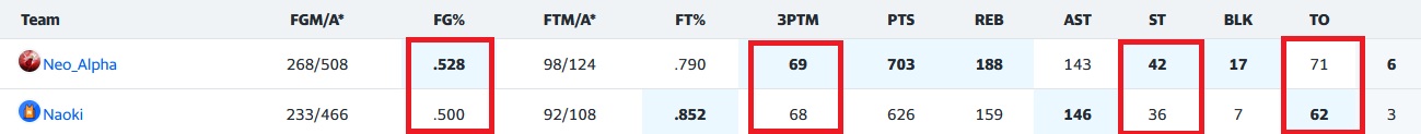 Duel dans la stratosphère de la ligue, et avantage à Néo en dépit de son nombre de joueurs absents plus conséquents, il arrache de 0.28FG%, 1 3PTM et quelques ST une très grosse victoire.