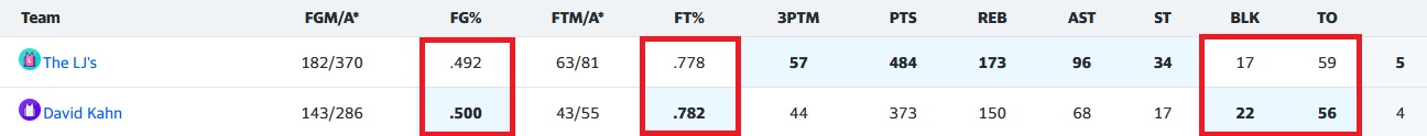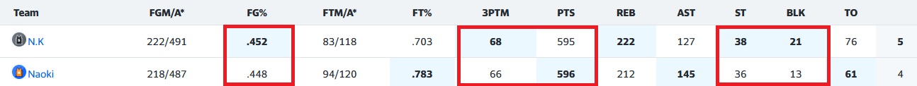 Face à cette armada, l’aiglon n’est pas démuni, il nous sort de très, très belles stats aux FT/RBDS/AST. Il constate cependant une baisse de régime un peu générale dans l’effectif, avec du Ryan Hollins, du Bam Adebayo assez moyens. Il a pourtant de belles armes avec un gros backcourt composé de K.George (63pts, 16rb ds, 27ast, 6st), James Harden (73pts, 8 3PTM, 14rbds, 22ast) et Scottie Barnes (66pts, 19rbds, 18ast). Néanmoins cela reste simplement bon, pas excellent. On aura bien eu Dillon Brooks pour faire illusion (79pts, 15 3PTM) avec Miles Bridges (63pts, 8 3PTM, 27rbds, 18ast)mais c’est pas moins de 4 joueurs qui perdent plus de 9 ballons et la gabegie offensive de George ou Harden assassine les FG%. Merci à Gobert (34pts, 55rbds, 4st, 6blks) et Derik Queen (40pts, 42rbds, 28ast, 6st, 6blks) d’avoir maintenu leur rang pour chercher les RBDS, dommage qu’un Adebayo soit si timoré. Le retour des derniers blessés devrait redonner de l’élan à l’effectif dès la semaine suivante.