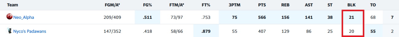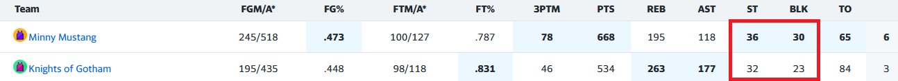Car même s’il jouait sans Brandon Miller, Mustang tire sa force d’un trident offensif assez instoppable et qui coche toutes les cases pour chercher les FG/3PTM/PTS! On retrouve sans surprise Edwards aux avant-postes (99pts, 14 3PTM, 19rbds, 18ast, 2st, 5blks) et surtout Tyrese Maxey (117pts à 48% et 80%, 13 3PTM, 14rbnds, 20ast, 11st, 5blks) en plus d’un Avdija sensationnel (119pts à 48% et 88%, 9 3PTM, 22rbds, 21ast, 6st)! On comprend mieux comment on sécurise les FG mais aussi les TO, kudo à Maxey (9), Edwards (8) ou encore Naz Reid (9) qui a aussi été très productif (65pts à 52FG%, 12 3PTM, 28rbds, 10ast, 4st, 5blks) et immensément all-around. On a donc 48 3PTM, 15blks ou encore 23ST sur ce seul quatuor. Il suffit de rajouter un Sharpe très précis et versatile (69pts, 10 3PTM, 13rbds, 15ast, 3st) et les tours jumelles Mark Williams (37pts, 32rbds, 6blks) – Holmgren (54pts, 28rbds, 6blks) pour terminer de garder FG/ST/BLK/TO. Le tout en ayant un plus gros volume de jeu que son adversaire et en infériorité numérique, chapeau bas.