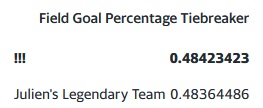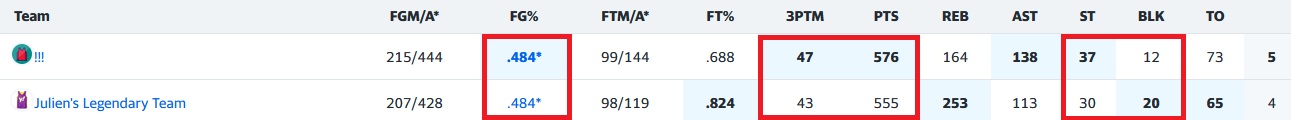 Le poitevin est tout de même bien solide sur ses appuis avec le retour remarqué de ses cadres en dehors de Suggs et Jalen Green encore sur la touche. Je pense surtout à Wemby (96pts à 88FT%, 7 3PTM, 32rbds, 6st, 8blks pour 7TO!) qui mène un frontcourt où Anunoby (64pts à 55% et 82%, 8 3PTM, 20rbds, 5st) et LBJ (56pts à 50% et 84%, 17rbds, 18ast, 5st) font montre de propreté et de versatilité. Le MVP est à chercher sur le backcourt puisque Jaylen Brown explose les compteurs (99pts, 11 3PTM, 31rbds, 22ast) mais il assassine les FG%/TO comme un grand garçon (38.5%, 19TO). On note les belles pioches pour chercher les 3PTM/ST avec du Coulibaly (34pts, 17rbds, 8st) ou la bonne semaine de Garland (67pts, 20ast). C’est plus complet, qualitatif et quantitatif, ça aurait peut-être mérité mieux, je te le concède.