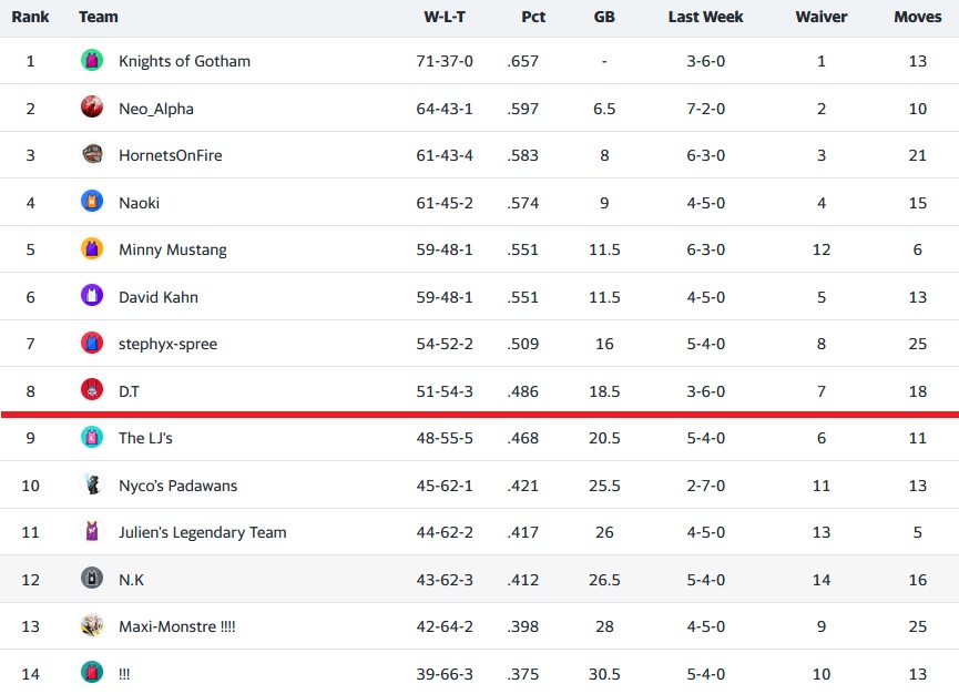 Larry remporte quant à lui une victoire méritée, il n’échoue pas loin de chercher les pourcentages et TO voire BLK, donc pas loin du 9-0, un peu rageant de ne ramener qu’une moindre victoire au bercail. Il a pu se reposer sur un effectif presque au complet à l’exception de Ja « Le Teubé » Morant IR. C’est simple, avec trois stars très productive, il réussit à faire des scores d’équipe complète. On remercie donc chaleureusement Steph Curry on fire (116pts à 48% et 94%, 16 3PTM, 13rbds, 28ast, 4st) devant Kawhi (75pts, 7 3PTM, 23rbds, 10ast, 8st) et Evan Mobley (63pts à 62FG%, 14rbds, 11ast, 4st, 3blks). Malheureusement, le trade de McCollum, le retour de Giannis qui vampirise Kuzma/Portis et les absences de MPJ (52pts, 8 3PTM) voire le fantôme de Gillespie, n’ont pas aidé à chercher ces maigres stats manquantes. Pire, le supporting cast est suffisamment mauvais pour tirer vers le bas l’équipe.